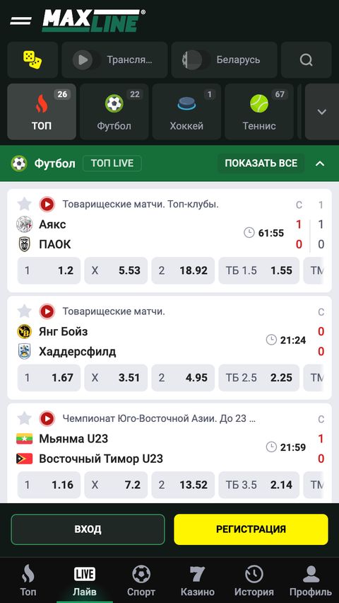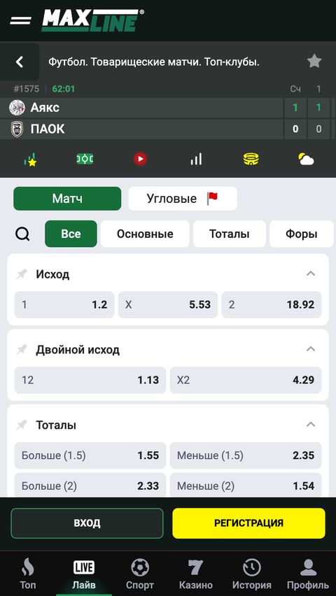 Широкая роспись доступна на каждый матч, в том числе разнообразные тоталы, форы, исходы и другие специализированные типы ставок. Для любителей быстрых решений предусмотрена игра в режиме Live. В лайве можно смотреть прямые трансляции, но только после входа учетной записи «Макслайн».
